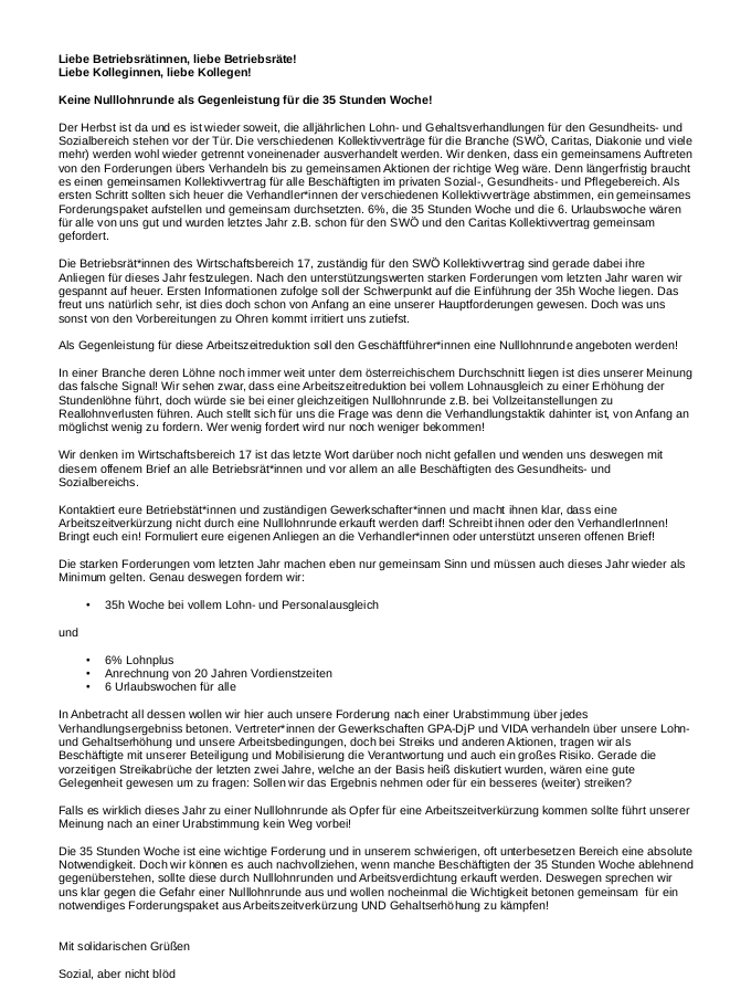 Mittlerweile wurde dieser von Betriebsrät*innen und Arbeitnehmer*innen aus verschiedenen Bereichen des Sozial- und Gesundheitsbereichs unterzeichnet.